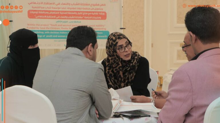 في إطار تعزيز أدوار الشباب والنساء في تحقيق الاستقرار المجتمعي، نفذت مؤسسة شباب سبأ مشروع “مشاركة الشباب والنساء في الاستقرار الاجتماعي” ، حيث تم تدشين ورشات نقاشية في ثلاث محافظات يمنية هي تعز، عدن، ولحج.
